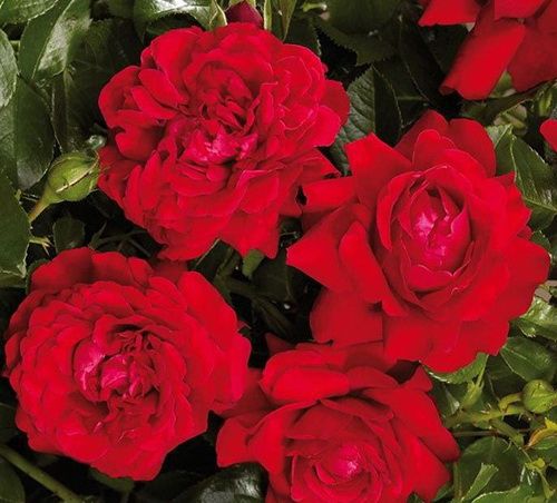 Саженец плетистой розы Гранд Эвод (Grand Award) отличается темно-красными, бокаловидными бутонами. Цветки ярко-красного до темно-красного оттенка, чашевидной формы, махровые, с 30-40 лепестками в каждом цветке. Диаметр цветка составляет 10-15 см, а аромат легкий, напоминающий шиповник. Цветение обильное и повторное, цветки собраны в небольшие соцветия.