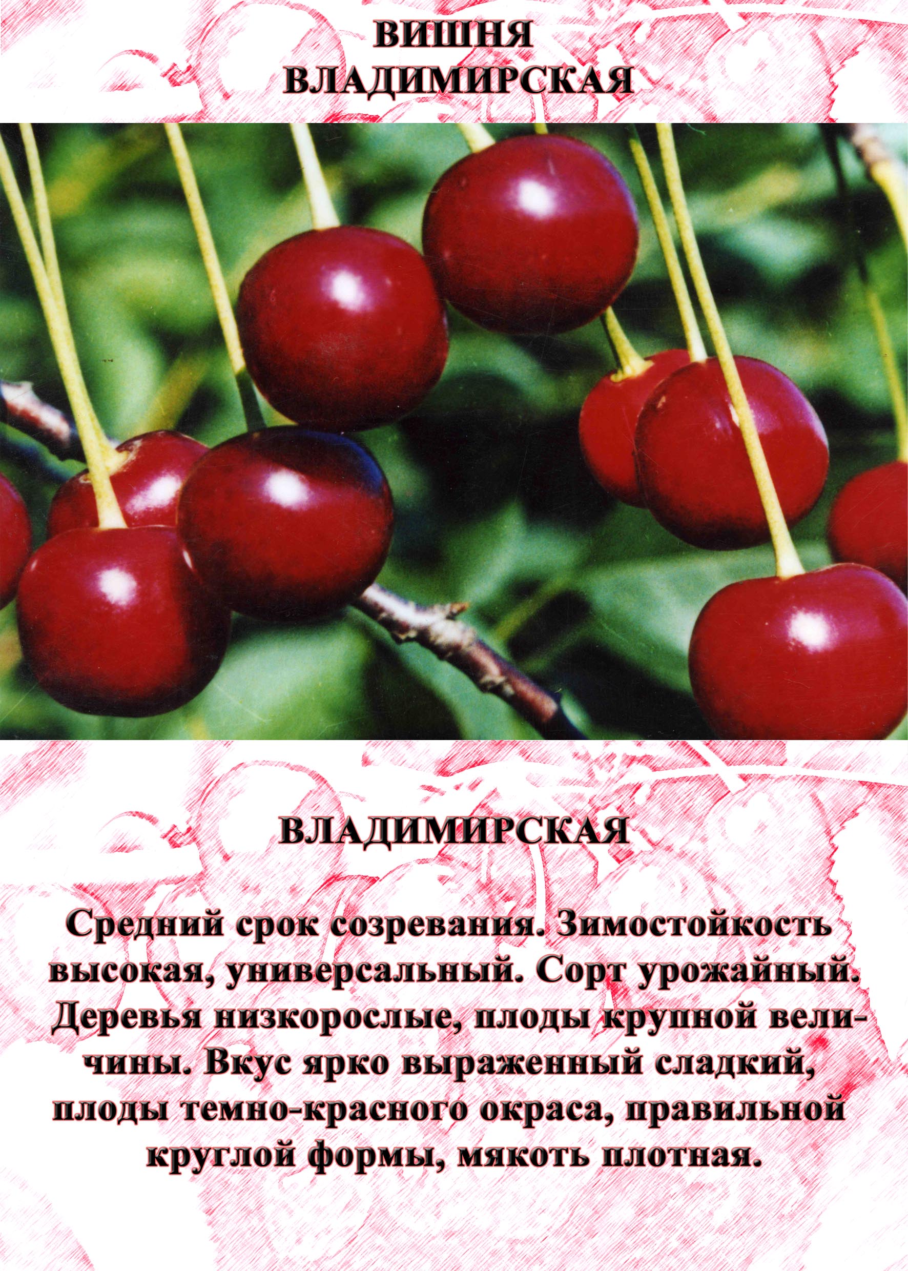 Этот сорт вишни известен уже очень давно и считается одним из самых старых в России. Он относится к самобесплодным, поэтому для получения стабильного и обильного урожая необходимо высаживать рядом растения других сортов. Наилучшими опылителями для Владимирской вишни являются сорта Гриот, Любская и Васильевская. Первые плоды с привитого дерева можно собирать уже на 3-4 год после посадки. Сорт рекомендован для выращивания в Центральном, Волго-Вятском, Северо-Западном, Средне-Волжском и Центрально-Черноземном регионах России.