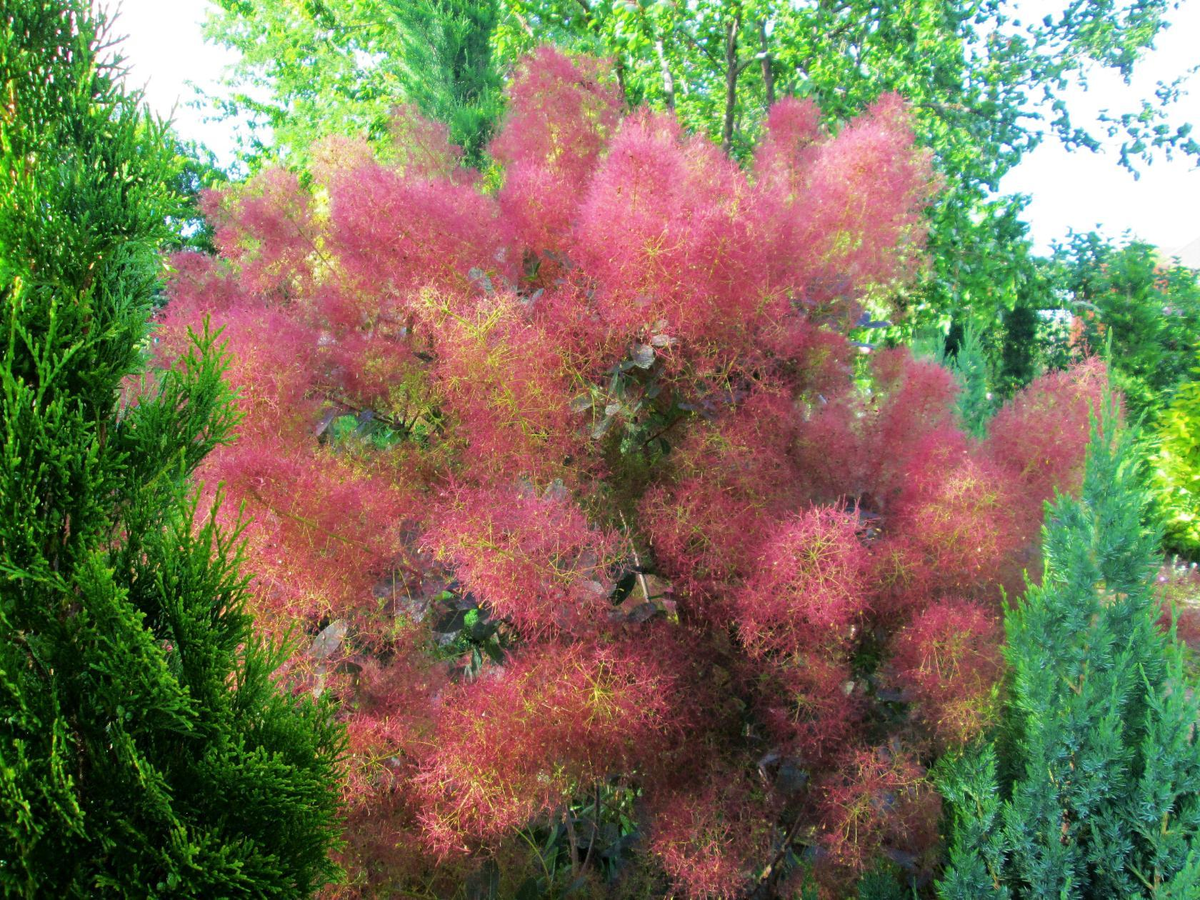 1. Декоративность: Пурпурные и зеленые листья, а также пушистые цветочные гроздья делают скумпию эффектным элементом любого сада.
